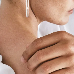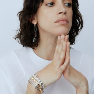 This outstanding link earring is handmade in recycled sterling silver interposed with a single link in solid 18k gold. The links are designed according to the ancient art of Japanese wood joinery – the links fit neatly together when still, but come softly alive in movement.