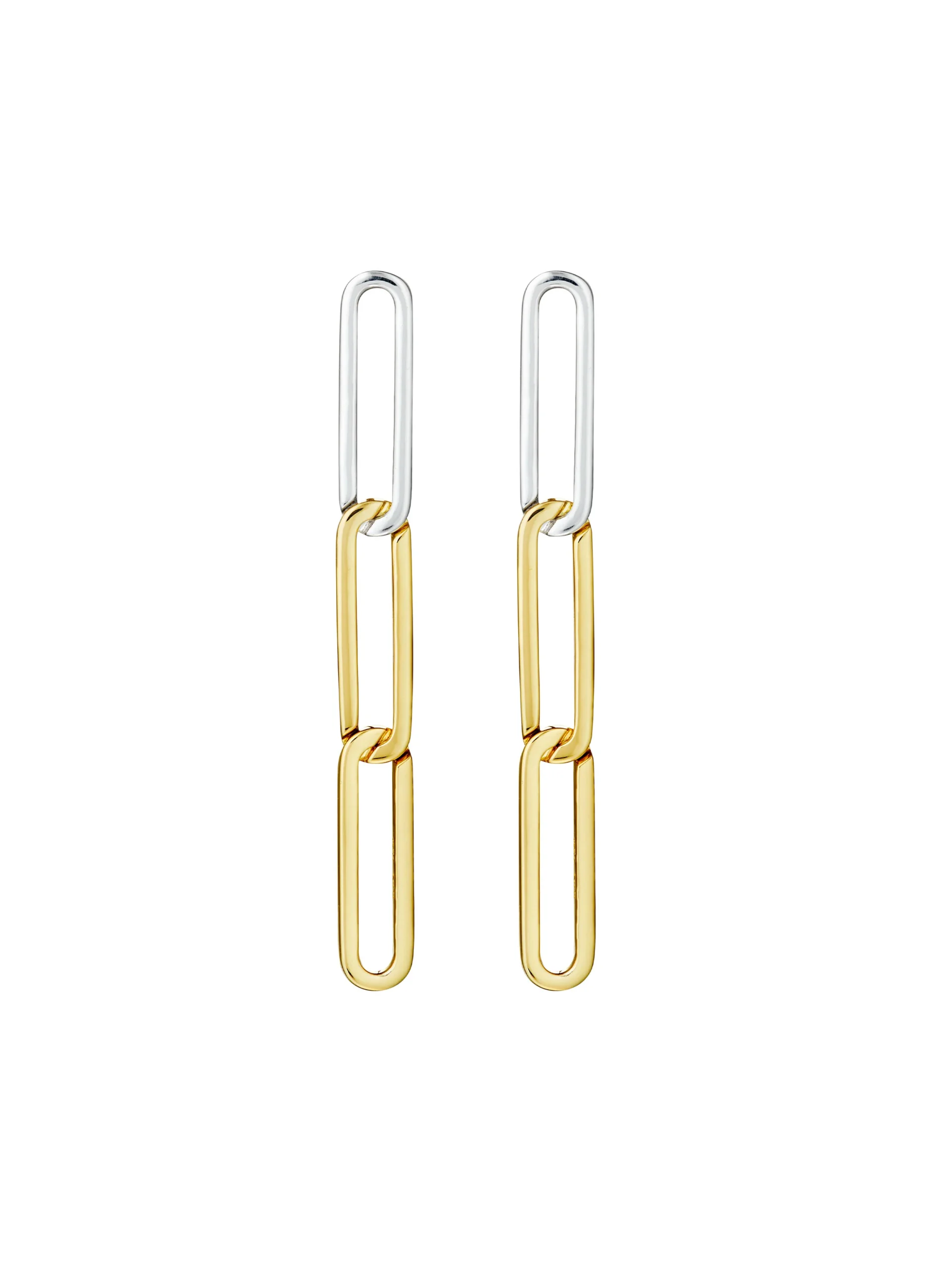 These elegant earrings from The Oxygen Collection combine recycled sterling silver and 18K gold in interlocking links inspired by Japanese joinery. Their lightweight, sculptural design moves gracefully, showcasing timeless elegance and expert craftsmanship. Handcrafted by skilled artisans, they bring a refined touch to any look.