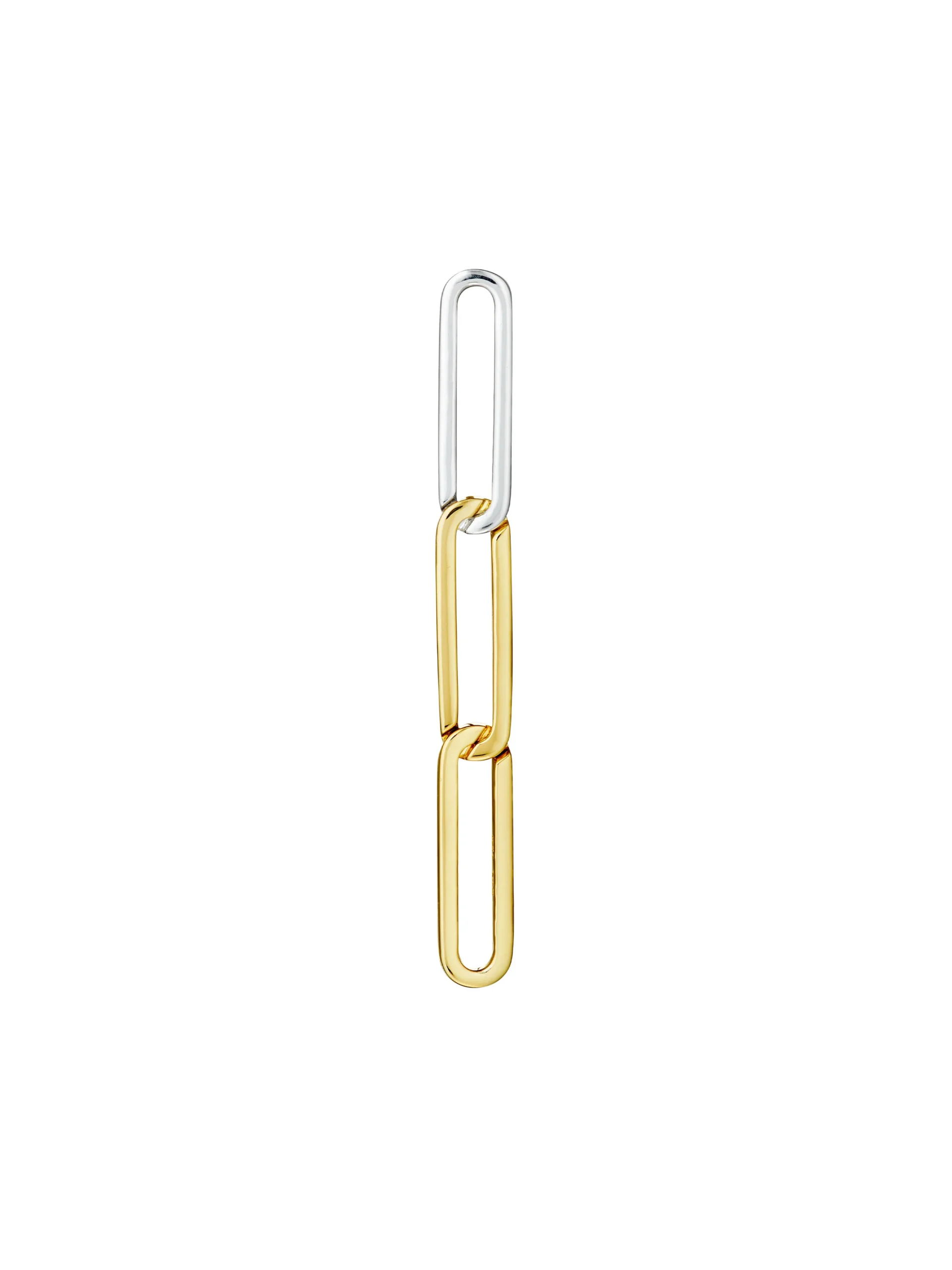This outstanding earring is handmade in solid recycled 18k gold interposed with a single link in silver. The links are designed according to the ancient art of Japanese wood joinery – where the links fit neatly together when still, but come softly alive in movement.