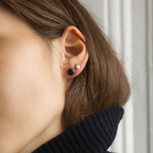 UNSUSPECTED VIOLETS earstick in solid recycled 18k gold adorned with a black, brilliant-cut Mpingo Blackwood diamond, 6 mm diameter. For your treasured core collection of earrings, this timeless earstick is an obvious match with other designs – or naturally, to wear on its own.